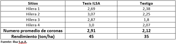 Las evaluaciones se referían al número de coronas por planta, que esta directamente relacionado con el rendimiento final. De hecho, el resultado de la tesis ILSA fue un promedio de tres (3) coronas por planta, con un rendimiento de 45 ton/ha de fresas, en comparación con el testigo que, con sus dos (2) coronas en promedio por planta, dio un rendimiento final de 35 ton/ha.