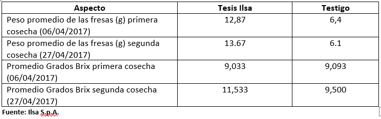 Resultados: Ilsadrip Forte se integra a la práctica nutricional del agricultor para evaluar el efecto del hidrolizado enzimático que contiene 11% de nitrógeno orgánico y más de 60% aminoácidos esenciales de tipo levógiro, de fácil asimilación y efecto bioestimulante inmediato debido al tamaño de sus moléculas (aminoácidos libres y péptidos de 4-5 aminoácidos), sobre la mejora de las características vegetativas y productivas de plantas de fresa.Se observo en campo efectos positivos en el ciclo del cultivo, a partir del enraizamiento hasta la producción y maduración de las fresas.Los resultados evidencian que en las dos cosechas la tesis ILSA mejoro los parámetros peso del fruto y grados Brix para las dos cosechas en comparación con el testigo.