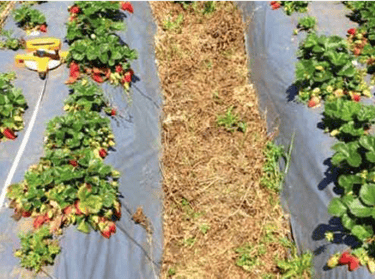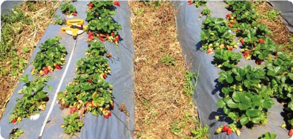 Comparación visual entre las plantas de fresa de la variedad Camorosa, en la que se observa en el tratamiento de la tesis Ilsa, con mayor vigor (surco de la derecha) versus el tratamiento convencional (surco de la izquierda)